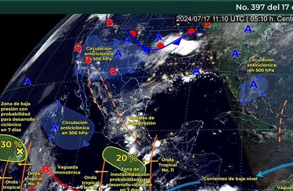 Oaxaca de Juárez, Oax. 17 de julio de 2024.- La Coordinación Estatal de Protección Civil y Gestión de Riesgos (CEPCyGR), informa que la aproximación de la onda tropical 11 en combinación con canales de baja presión en el interior de México, desarrollarán lluvias de intensidad variable en áreas montañosas de la Sierra Sur, Sierra de Juárez y zonas altas de la Cuenca del Papaloapan.