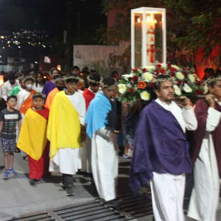 En cumplimiento al Evangelio, portando velas, las encendieron del cirio pascual y las y los presentes se dirigieron hacia su templo en el que el Sacerdote proclamó el Pregón Pascual: “Alégrense, por fin, los coros de los ángeles, alégrense las jerarquías del cielo y, por la victoria de rey tan poderoso, que las trompetas anuncien la salvación. Goce también la tierra, inundada de tanta claridad, y que, radiante con el fulgor del rey eterno, se sienta libre de la tiniebla que cubría el orbe entero. Alégrese también nuestra madre de la iglesia, revestida de luz tan brillante; resuene este recinto con las aclamaciones del pueblo (…)”.